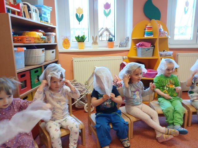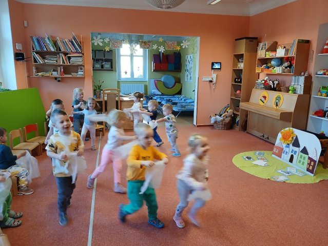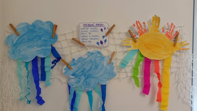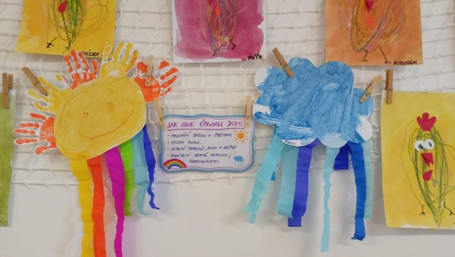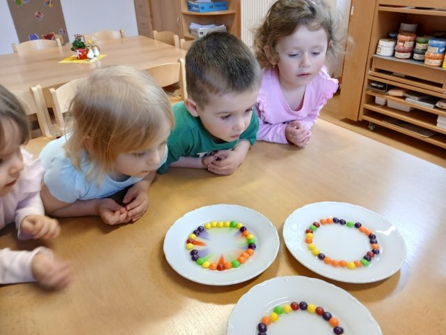 teplé dny s jarními bouřkami, kdy se nad obzorem rozzáří nádherná duha. V Kopretince si hrajeme se sluníčkem, větrem, mráčky i bouřkou. Tančíme, zpíváme a s velikým nadšením čarujeme duhu. Děti si vyzkoušely pokus s čarovnými kamínky a vodou. Panečku, to byla krásná duha…