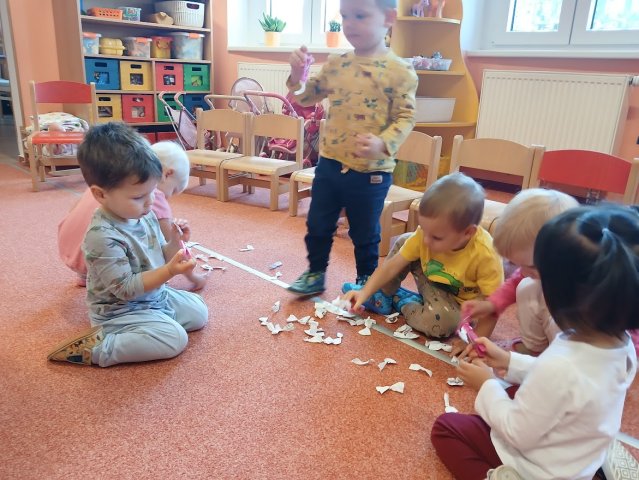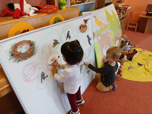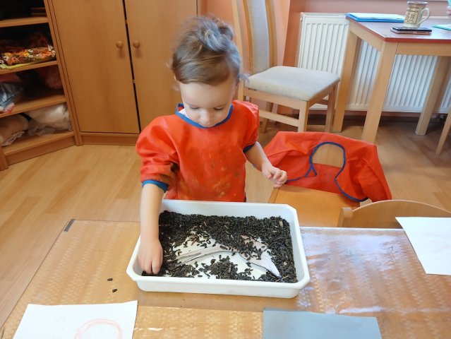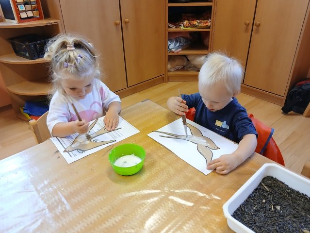 překážky, tiskali a nadšeně tvořili ze zrníček a semínek. Venku jsme pak ptáčky pozorovali a sypali jim dobrůtky.