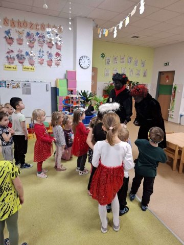 V pátek nás přišel navštívit Mikuláš, anděl i dva čertíci, kteří nebyli ale vůbec zlí! Stavili se u nás po cestě, protože hledali Mikuláše s andělem. Někde se jim po cestě ztratili a děti měly za úkol, že až je potkají, tak zavolají na čertíky. Nakonec se našli a děti pověděly v každé třídě básničku nebo zazpívaly písničku a dočkaly se i balíčku od Mikuláše, ušpinění od čertů pro štěstí a nakonec se většina s čerty skamarádila.