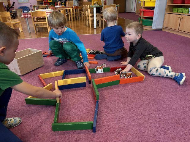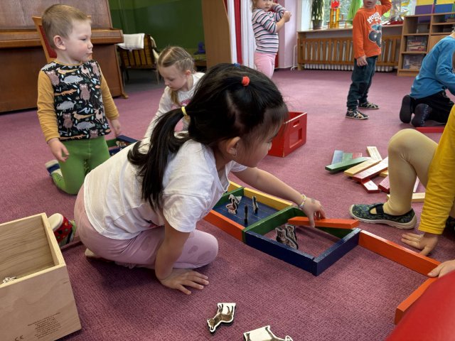 V březnu jsme si opakovali názvy domácích zvířat a jejich mláďat. Stavěli jsme zvířátkům ohrádky, hráli zvířecí pexeso nebo hledali zvířátka v knihách. Naučili jsme se píseň o koťátku nebo si v tělocvičně zahráli na koňské závody.